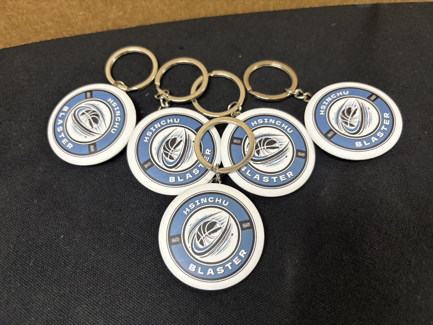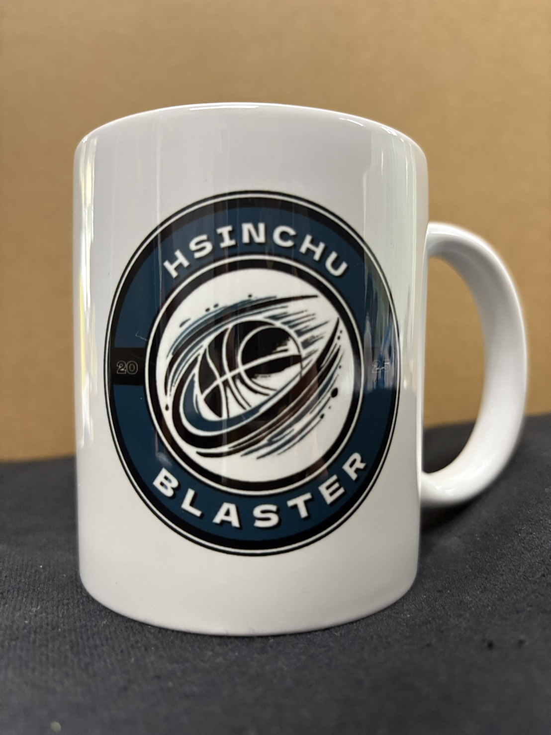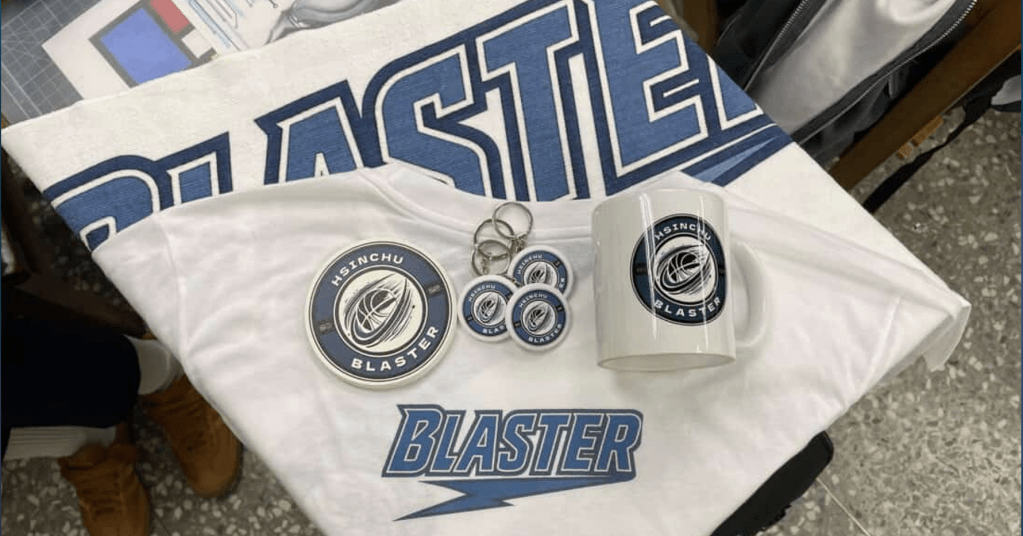 Merchandise featuring Hsinchu Blaster branding, including a T-shirt, mug, and keychains.